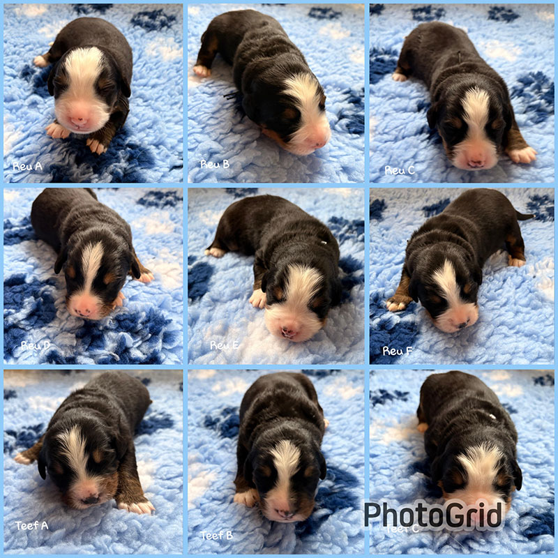 Homogeen nest, prima gewichten en bone. Duidelijk onderscheid tussen reu en teef.